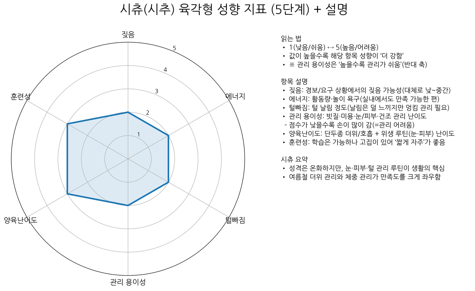 시츄는 짧은 코 때문에 더위에 약한 편이고, 얼굴 주변 털이 많아 눈·피부 관리가 중요해요.