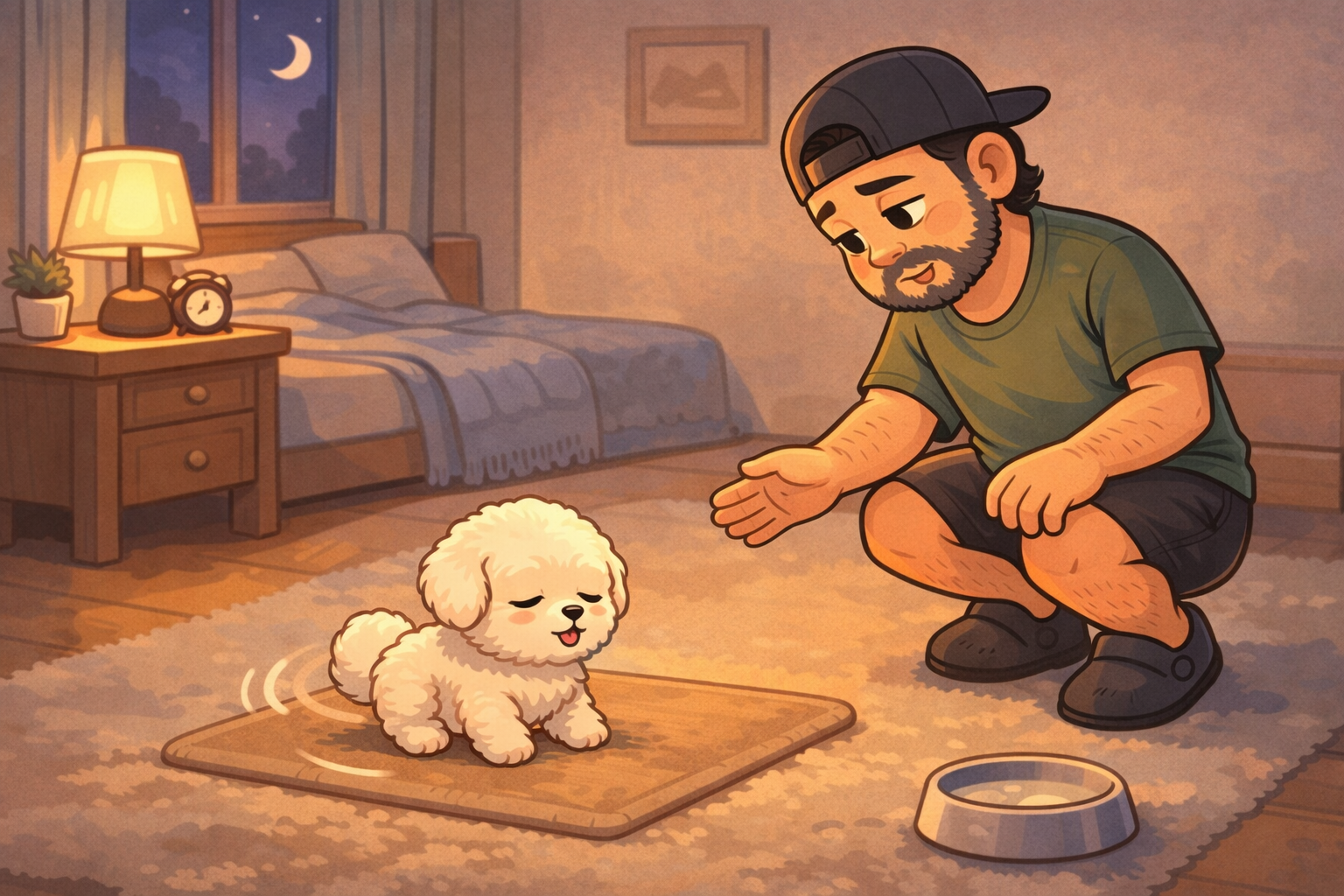 아기 강아지의 새벽 깨움은 배변 타이밍과 꽤 자주 연결됩니다. 잠들기 전에 마지막으로 배변 기회를 주고, 성공하면 짧고 차분하게 칭찬한 뒤 바로 정리하세요. 이 시간에 놀이로 이어지지 않게 하는 것이 중요합니다.