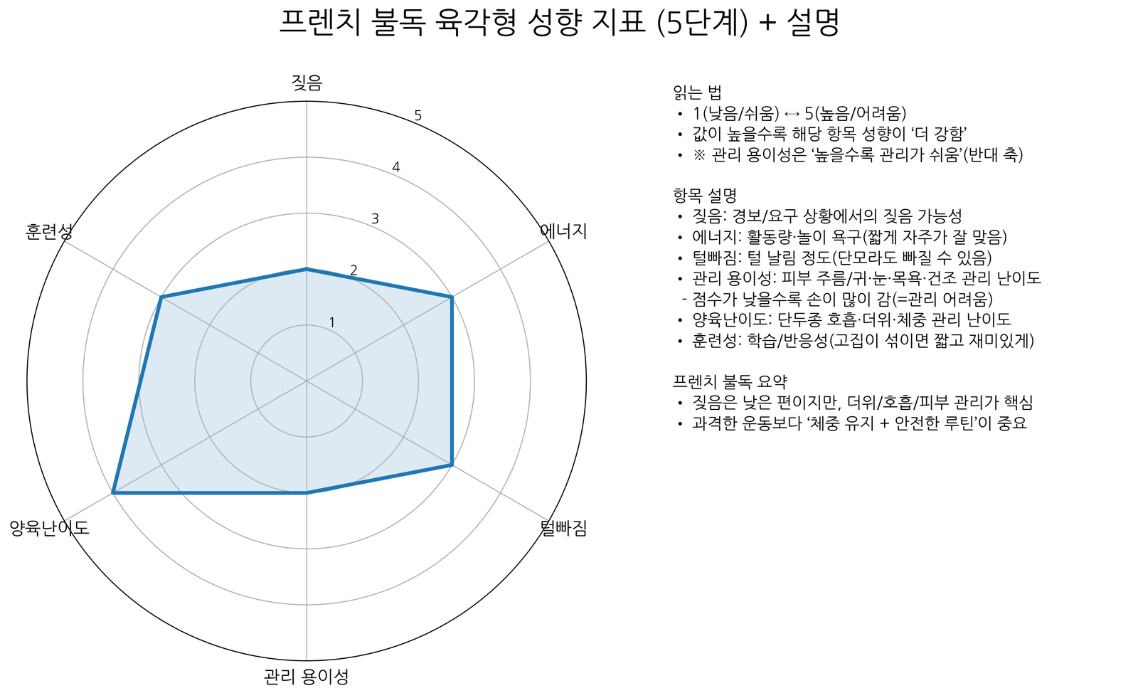 성격은 대체로 사람 좋아하고 장난기 많아 “가족형 실내견”으로 인기가 높지만, 프불은 다른 견종보다 생활 관리의 핵심 포인트가 확실합니다.
